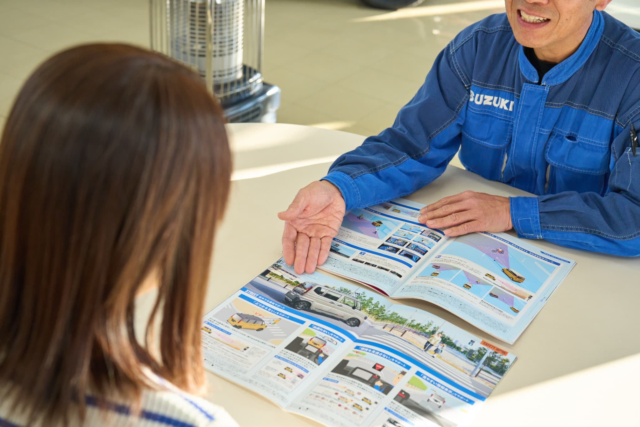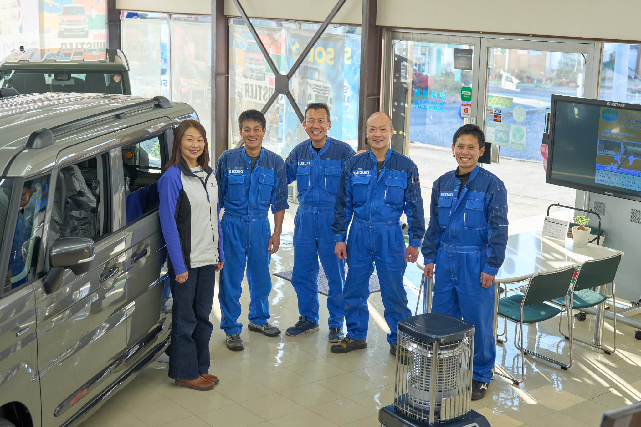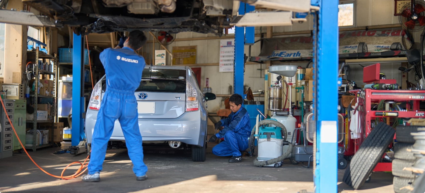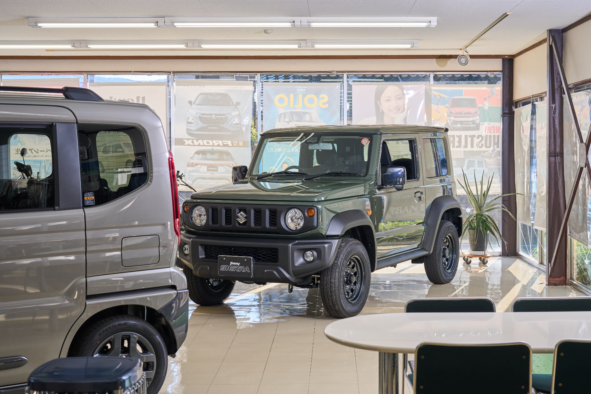 スズキ車を中心に、トヨタ・ホンダ・日産など国産全メーカーの販売・車検・整備に対応します。軽自動車から中型貨物、ダンプ・クレーン車などの特殊車両、さらに農機具まで幅広くカバー。